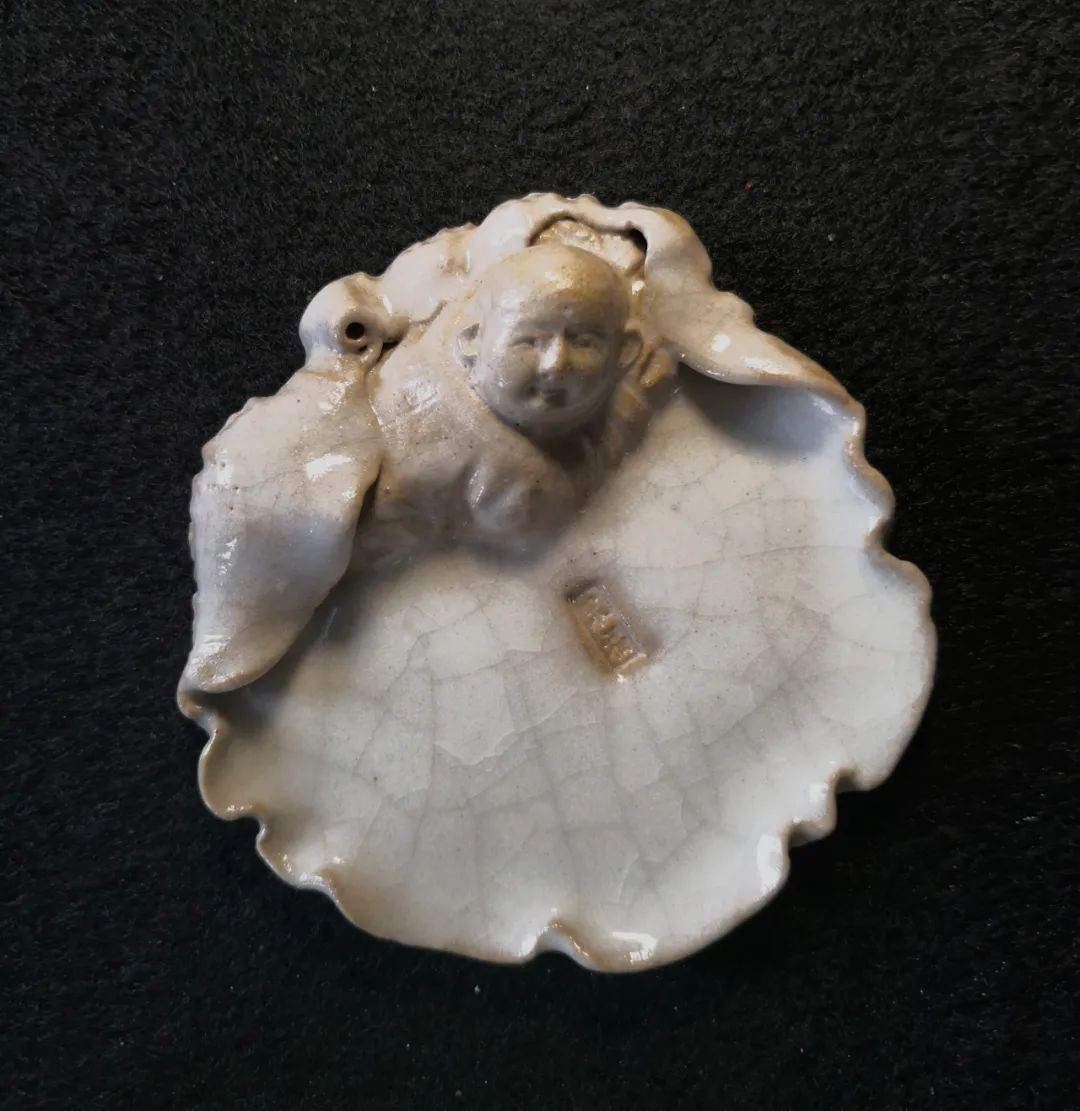 魏教授的這一批作品,名為筆舔,實則可以舔筆、香插和鎮紙三用。作品長寬約十余厘米,周邊以荷葉卷曲,形成一片“內?!?,并塑男童子、女童子、金魚于其上。童子雖有男女之別,但形貌各異,他們或笑,或嗔,或靜,或動,或憨,或巧,件件俱有不同。