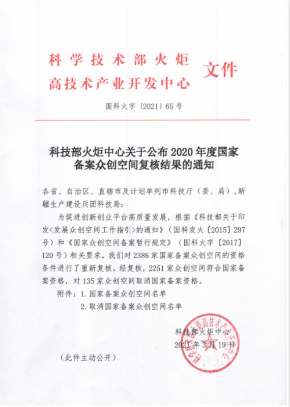 據悉,此次科技部火炬中心對全國2386家國家備案眾創空間的資格條件進行了重新復核,有2251家眾創空間符合國家備案資格,135家眾創空間取消國家備案資格。