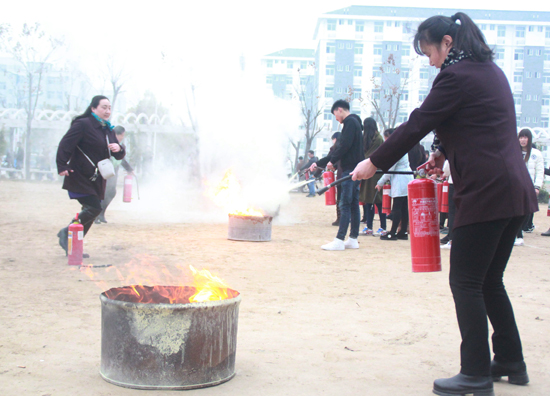 開封市消防支隊法制科科長馬兵向師生們講解了安全防火知識及逃生注意事項,示范了滅火器的正確使用方法。隨后參加演練的師生有條不紊地進行滅火演練。現場共設置5個引火點,師生們按照操作要領進行滅火演練,收到良好效果。
