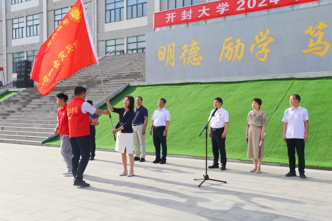 校黨委書(shū)記譚貞為防汛搶險(xiǎn)突擊隊(duì)授旗