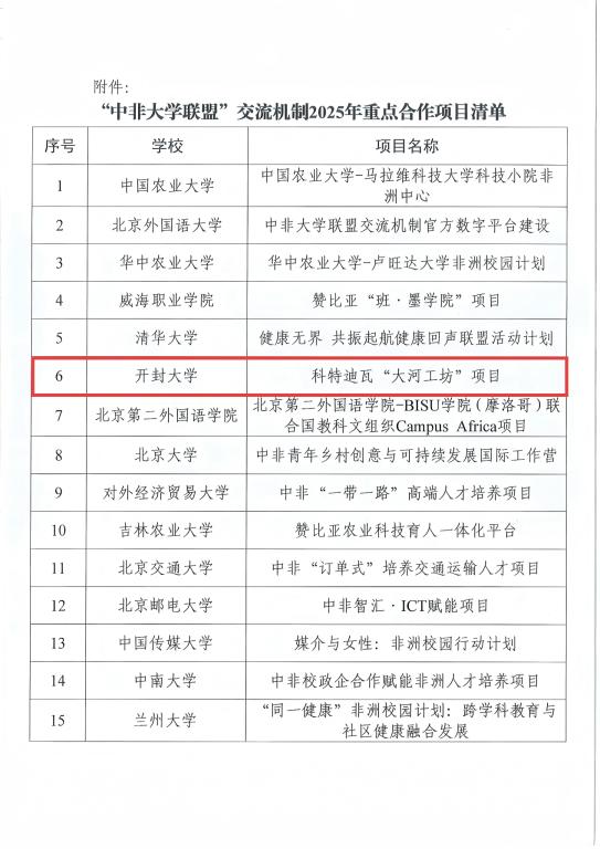 近日,中國(guó)高等教育學(xué)會(huì)交流機(jī)制2025年重點(diǎn)合作項(xiàng)目評(píng)審結(jié)果公布,開(kāi)封大學(xué)-科特迪瓦“大河工坊”項(xiàng)目成功入選,“成為河南唯一一所入選高校。