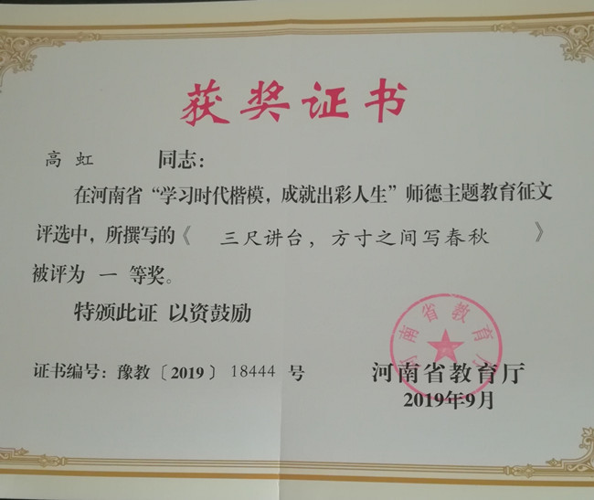 近日獲悉,我校外國語學院高虹老師在河南省“學習時代楷模,成就出彩人生”師德主題教育征文評選中所撰寫的《三尺講臺,方寸之間寫春秋》榮獲河南省教育廳師德教育征文一等獎。