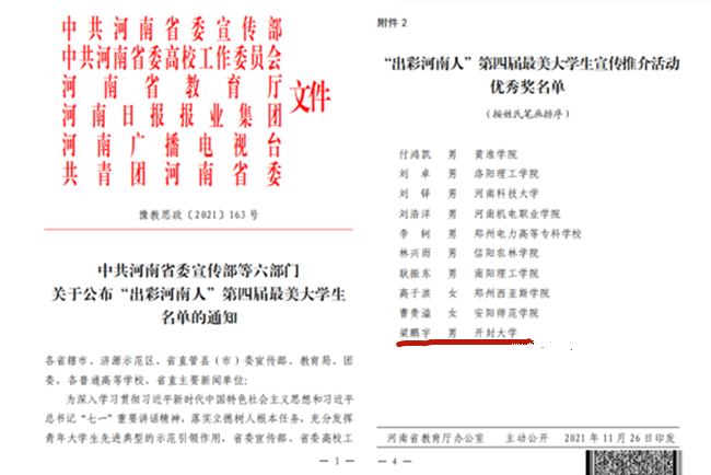 近日,“出彩河南人”第四屆最美大學(xué)生宣傳推介活動(dòng)結(jié)果公布,我校土木建筑工程學(xué)院2019級(jí)房地產(chǎn)經(jīng)營(yíng)與管理專業(yè)學(xué)生梁鵬宇獲優(yōu)秀獎(jiǎng),這是我校學(xué)生首次獲此殊榮。