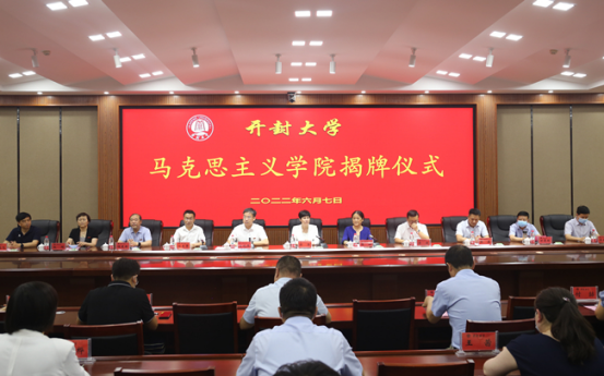 開封市委常委、市委宣傳部部長邵華,市委宣傳部副部長李濤,河南大學馬克思主義學院執行院長任東景、河南開封科技傳媒學院馬克思主義學院院長張磊、黃河水利職業技術學院馬克思主義學院院長焦紅強、開封文化藝術職業學院思想政治理論教學部主任張鶴鳴受邀出席儀式。開封大學校黨委書記陳燦、校長宋曉煒、校黨委副書記儲建新、副校長萬是明、副校長趙輝,以及相關職能部門負責人、各院黨總支書記、馬克思主義學院領導班子和全體思政課教師及學生代表參加揭牌儀式。儀式由宋曉煒主持。