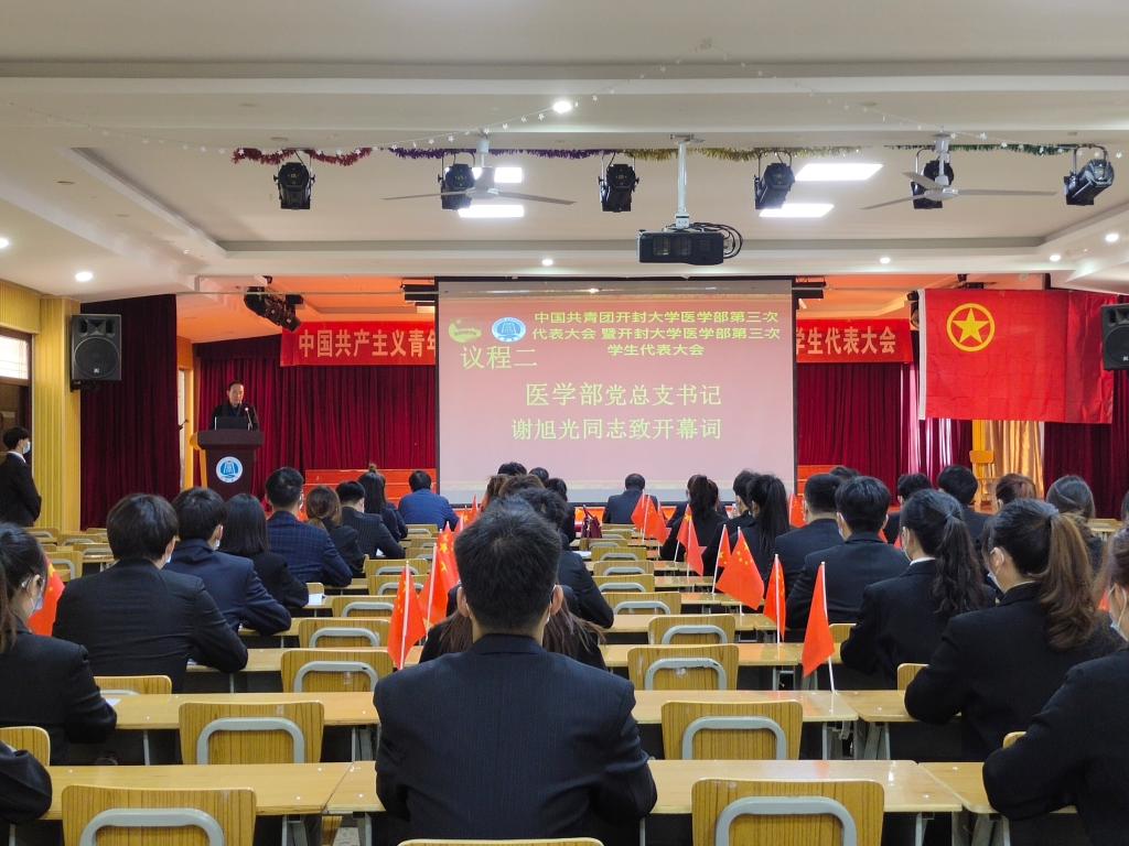 十一月十一日,大會如期而至,開封大學黨委委員、開封市衛生學校黨委書記曾小平、開封大學團委書記劉圣亞、開封大學醫學部黨總支書記謝旭光、開封大學醫學部學生黨支部副書記厲從志、開封大學醫學部團總支書記崔俊莉以及輔導員老師們蒞臨了本次大會。窗外冬日驕陽明烈,室內國歌、團歌莊嚴響起。醫學部各代表著裝整齊,手持國旗,伴隨著歌曲,齊聲高歌。