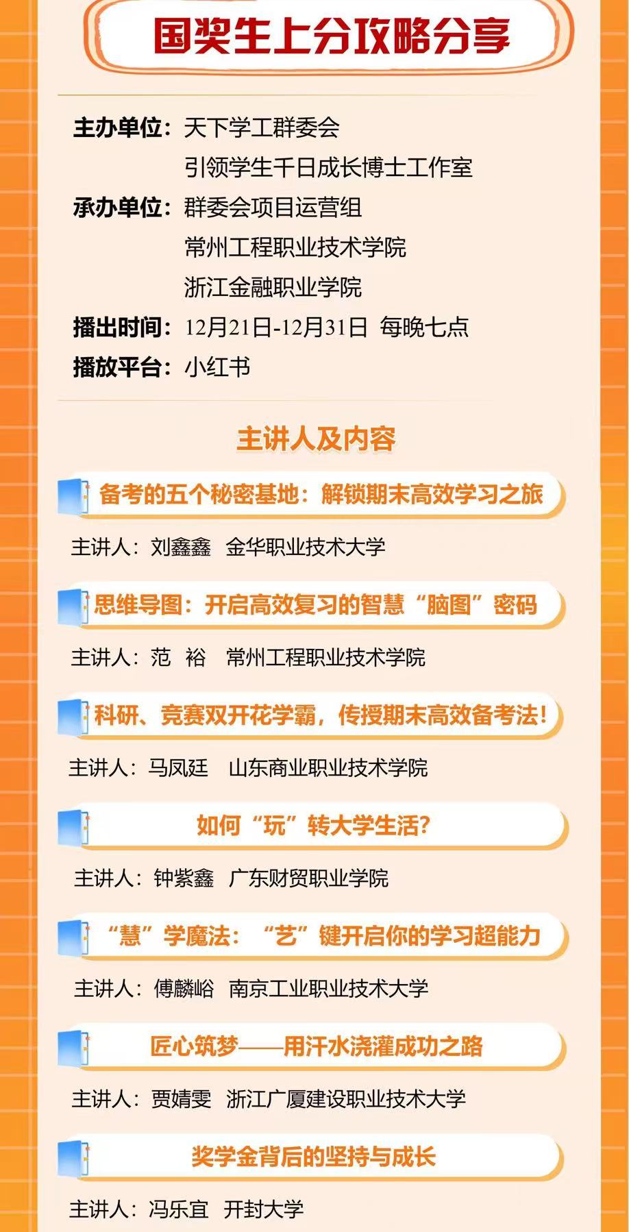 2024年12月21日,馮樂宜受邀參與全國高職學生工作網絡聯盟開展的【期末備考干貨·國獎生上分攻略】活動,客座小紅書直播為廣大學子分享經驗,傳遞榜樣力量。