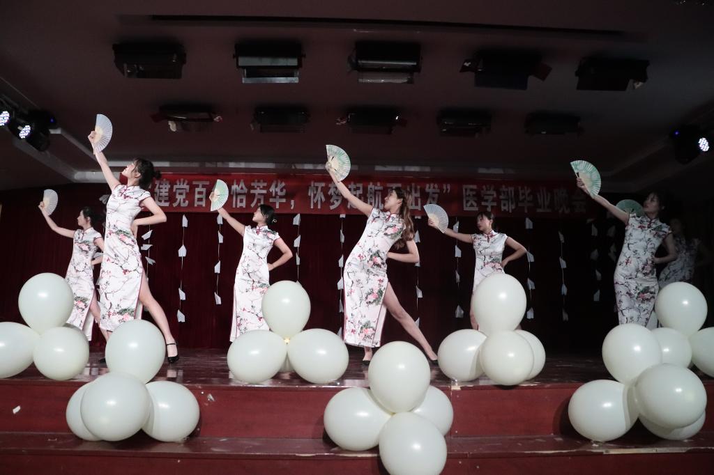 本次晚會分為“謝謝,我的大學”、“再見,我的青春”、“銘記黨恩·砥礪前行”三個篇章,勾勒出2021屆畢業生在校成長的不同階段,寓意學子畢業后不忘初心、緊跟黨走、砥礪前行、奮發拼搏。晚會在優秀畢業生演講《作為一名醫學子的誓言》中拉開帷幕。美輪美奐的旗袍舞蹈《伯虎說》、震撼人心的街舞《畢業季》、風趣幽默的相聲、小品《夢回大唐》,創新傳統文化古箏《漁舟唱晚》以及精彩絕倫的黨史知識競賽,講述紅色故事與青春記憶碰撞出別樣火花,致敬中國共產黨百年奮斗的光輝歷程,回眸2021屆畢業生勤學篤行的青蔥歲月。節目個個精彩絕倫、有聲有色,每一個節目的背后都是對畢業生美好的祝福,現場掌聲雷動,將晚會一次次推向高潮,青春昂揚的激情響徹整個會場。